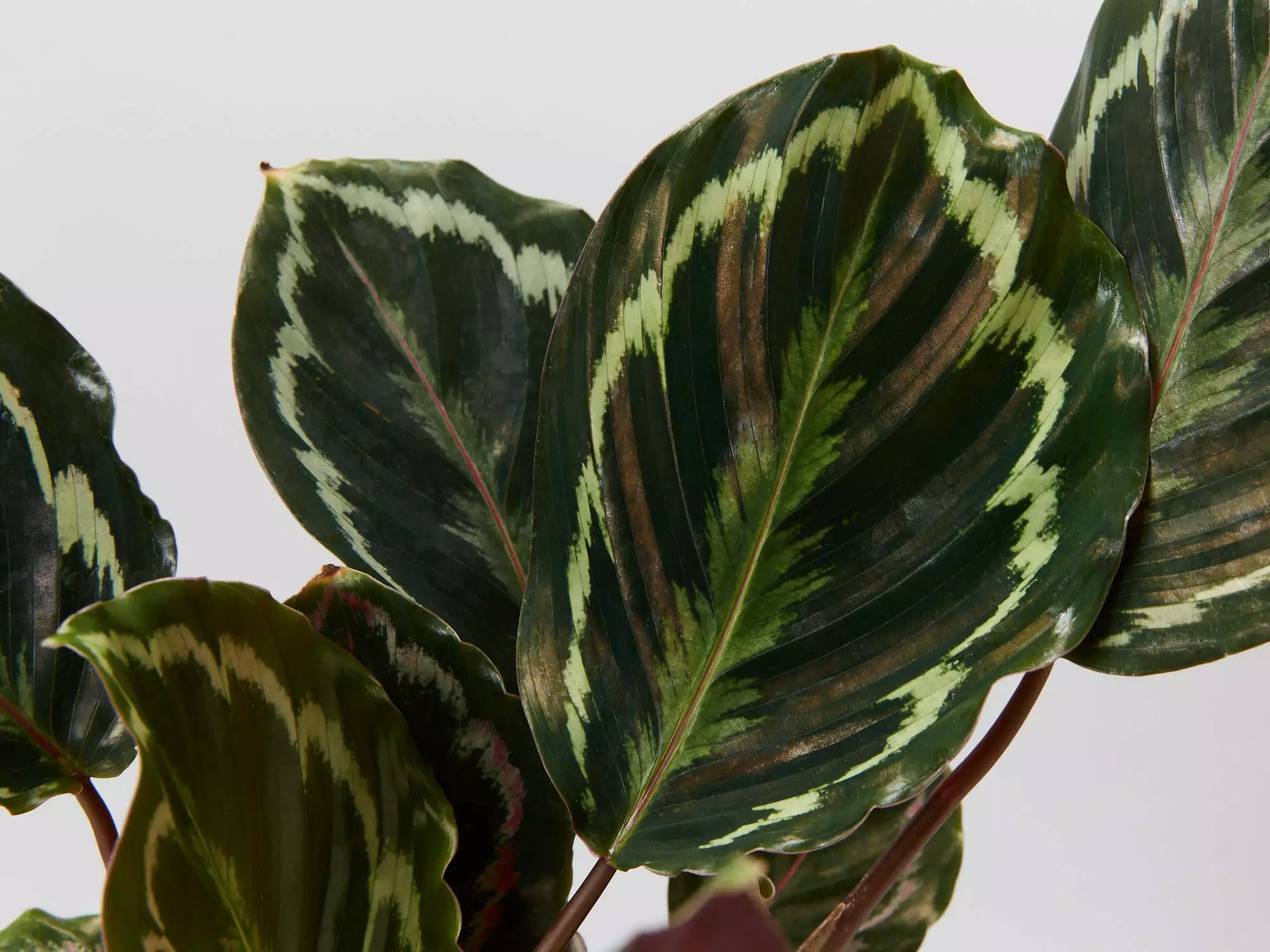Rose Painted Calathea. Her softly rounded leaves look like they have been lovingly hand-painted and are framed with a light green pattern which turns to a dark green moving into the centre. On the underside, her leaves are a deep burgundy. This little baby is a bit high maintenance so not ideal for beginners but if you follow our tips you will be rewarded with a show-stopping houseplant full of colour.