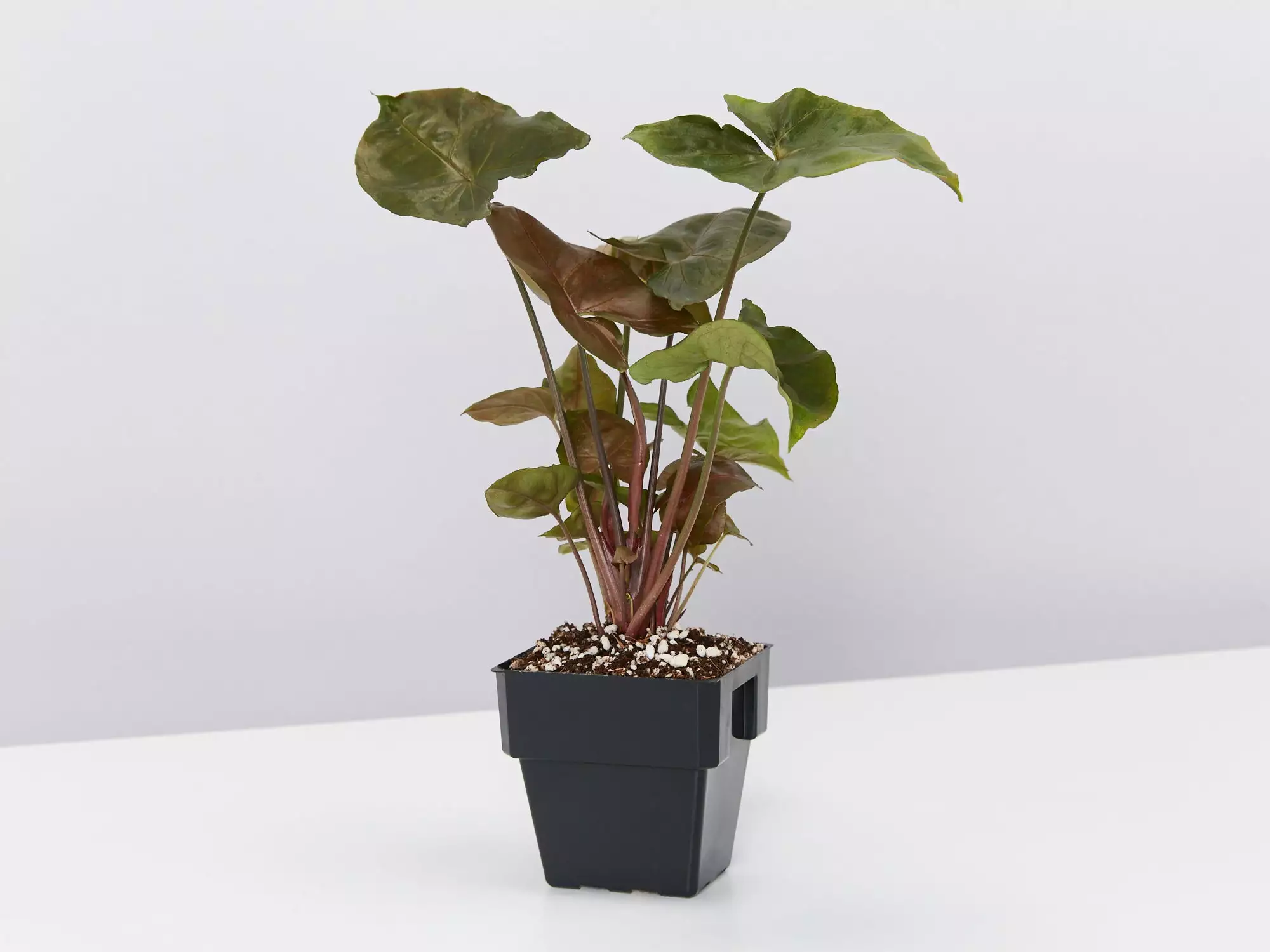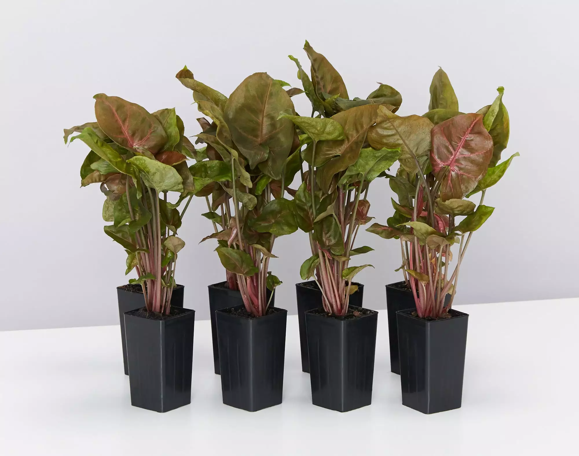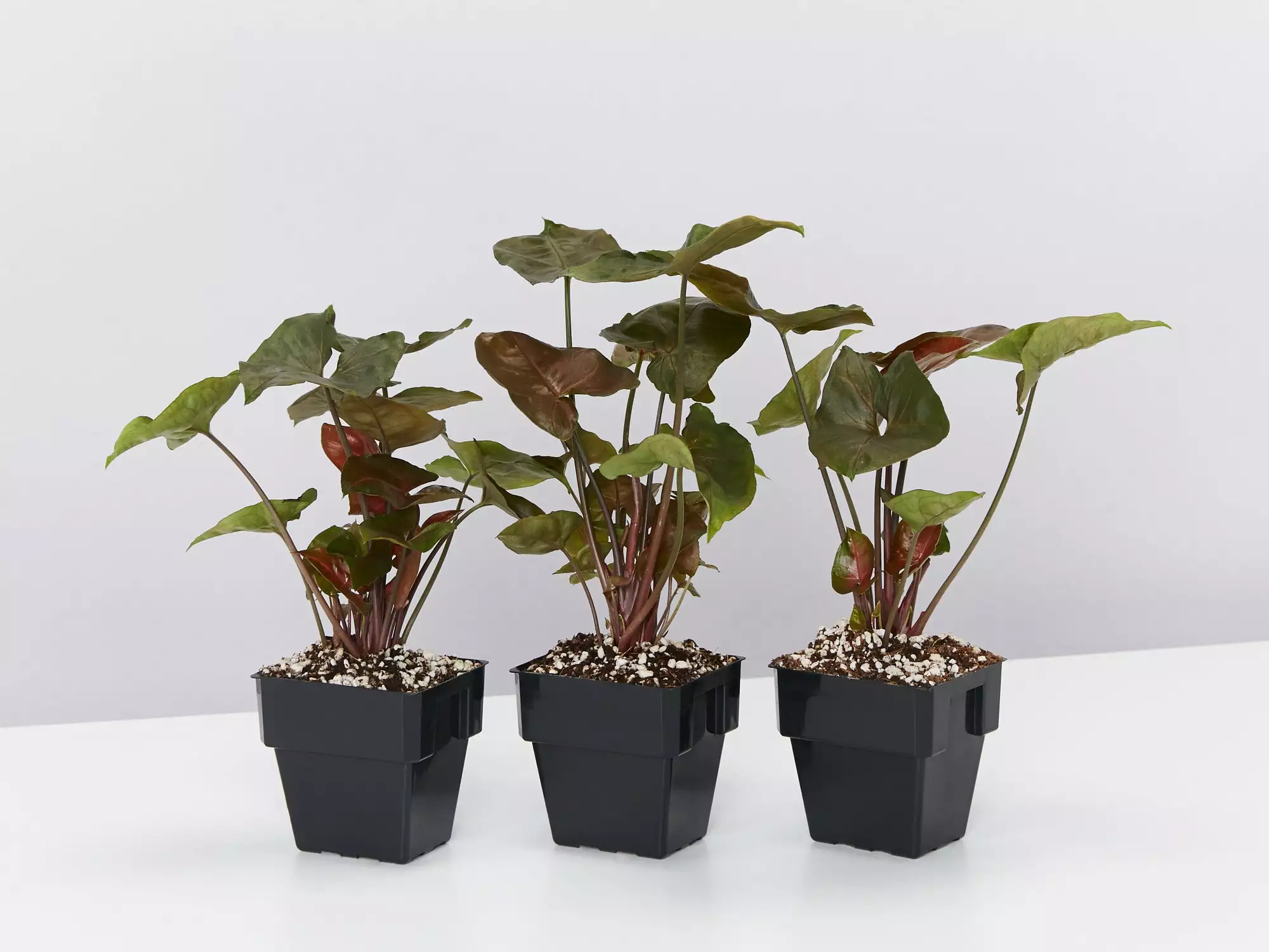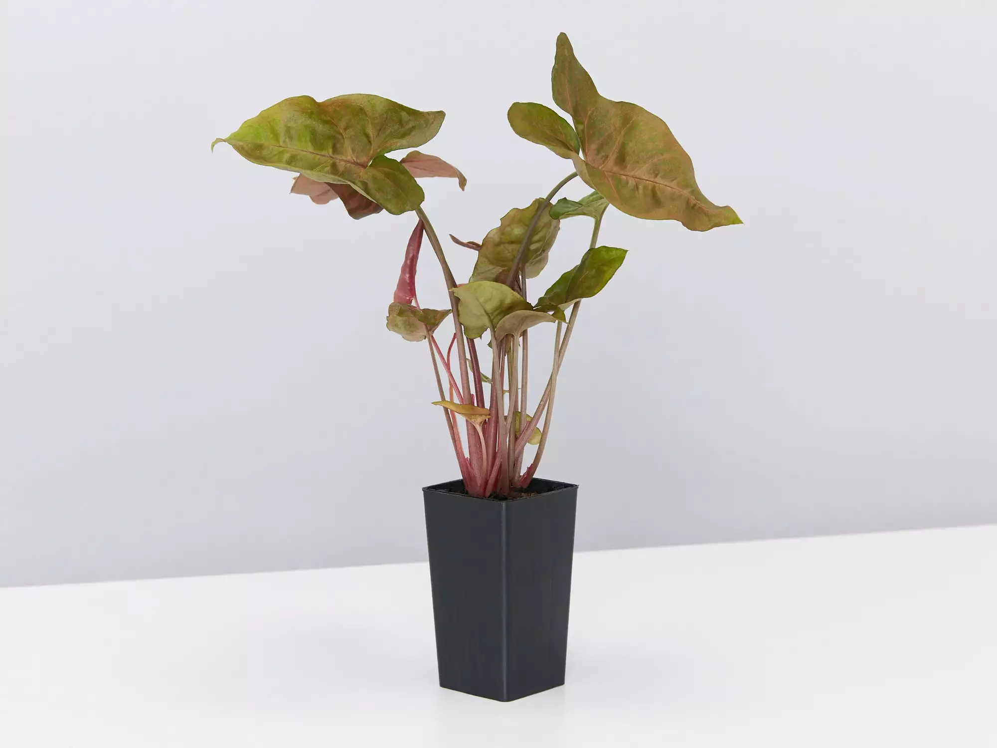 Syngonium podophyllum Bronze Maria is a natural evergreen beauty that shows off her traditionally arrow-shaped glossy leaves with bronze tones and red veins. She’s a pleasure to own, especially when the new growth pushes through in baby pink.